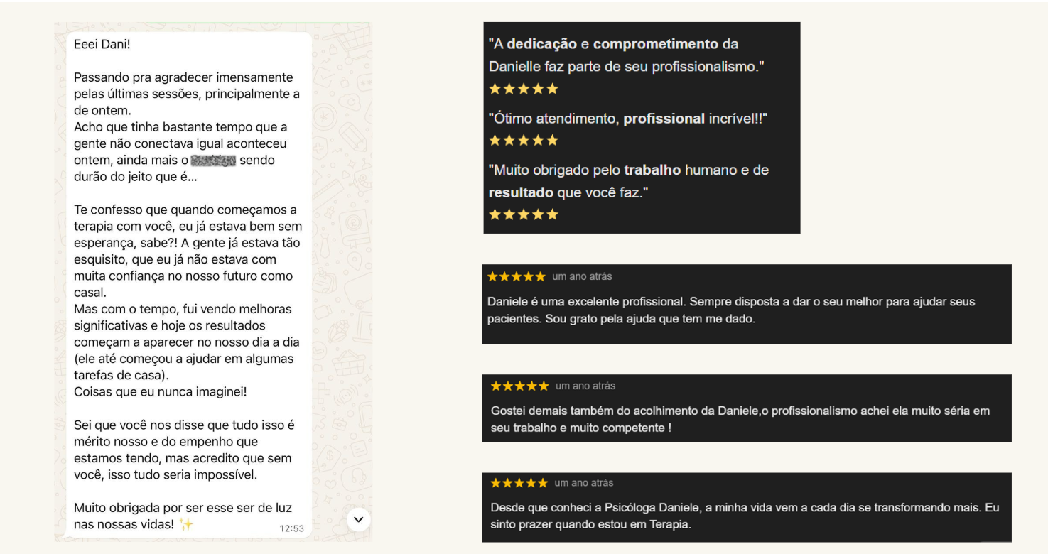 Sou Daniele Ferreira, psicóloga clínica de Belo Horizonte, casada com o Gustavo e apaixonada pelo meu trabalho. Desde o início da minha trajetória, sempre tive um olhar especial para os relacionamentos, isso porque percebo, na prática, como essa área impacta profundamente todas as outras dimensões da vida. Atuo exclusivamente online e, ao longo de quase 10 anos de experiência, tenho ajudado adultos e casais a atravessarem crises, reconstruírem conexões e criarem vínculos mais saudáveis. Quando o relacionamento melhora, há um efeito em cadeia: a autoestima cresce, o trabalho flui melhor, a vida ganha mais leveza.
